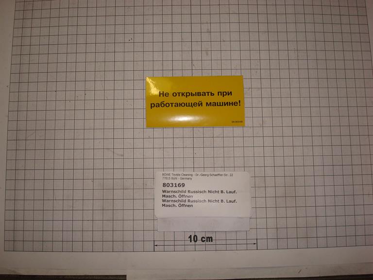 Warnschild Russisch: "Nicht bei laufender Maschine öffnen"