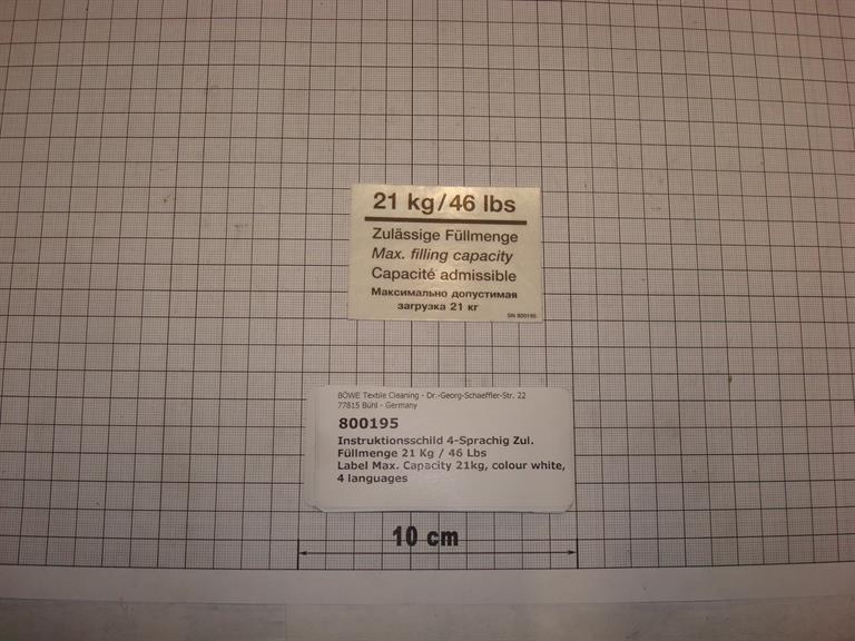 Label Max. Capacity 21kg, colour white, 4 languages
